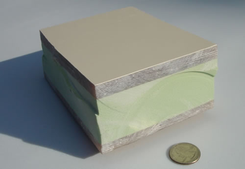 A cross section of the Transom – The transom uses a foam core with special properties. It’s very heavy, dense, extremely difficult to compress and is absolutely waterproof. The finished transom has approximately 1/2 an inch of laminate on each side of the foam core.