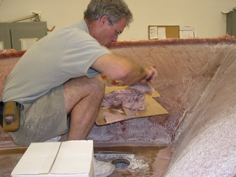 Glassing in the stringer grid – After the stringer grid has set, additional glass is added to insure a solid bond with the hull.