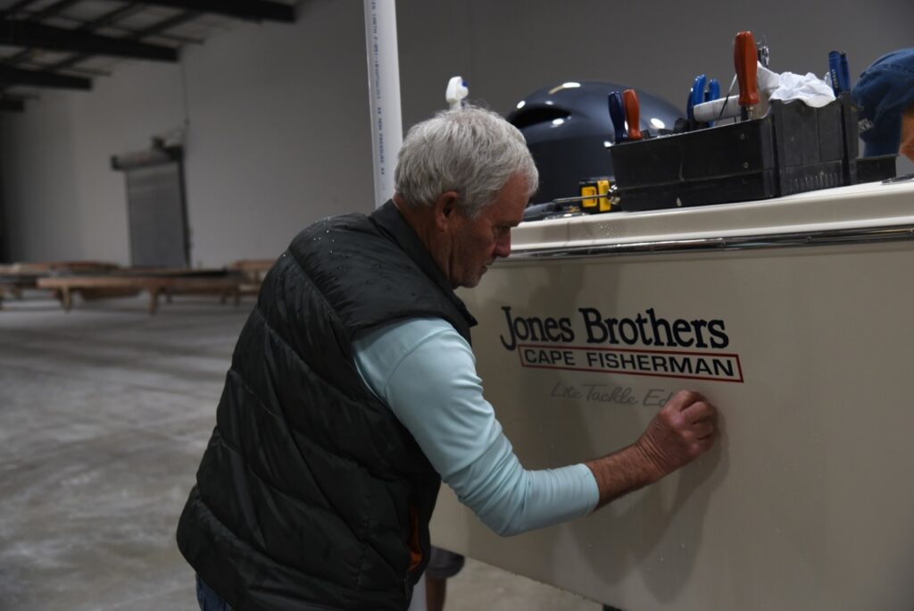 Adding the Decal – Donnie adds the Jones Brothers decal. The crew also details the boat, and goes through a checklist to insure that all components are installed, and the cushions, plugs, accessories are on-board before shipping.